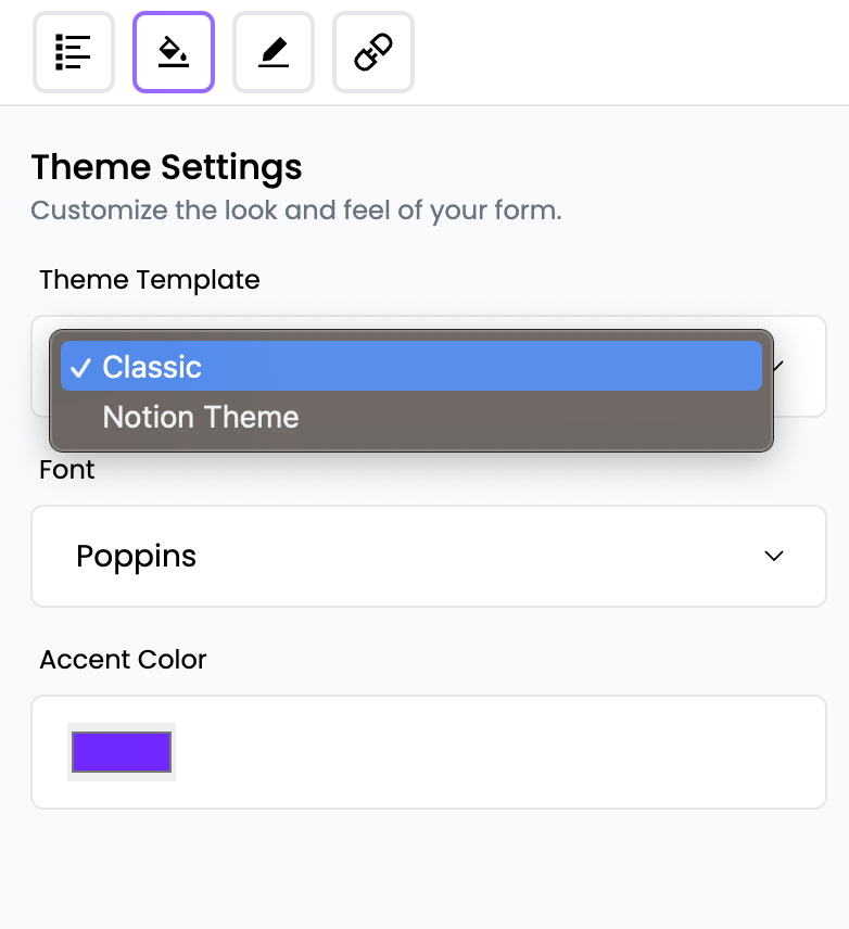 To change the theme template, click on Theme Template: you can choose from Classic and Notion Theme